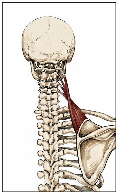 Taiji practitioners mostly focus on relaxing the Deltoid Muscles when relaxing the shoulder, but in fact attention should be placed on the Levator Scapulae Muscle (see diagram on the left), whose function is to elevate the shoulder blade. In Latin, “Levator” means to elevate. This superficial muscle originates in the Cervical 1 through Cervical 4 and inserts on the upper and middle border of the scapula.
