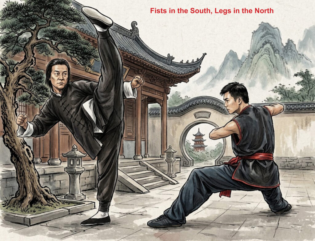 Chinese martial arts practitioners acknowledge the adage “Nan Quan Bei Tui (南拳北腿) – Fists in the South, Legs in the North.” While, in essence, this saying holds true, it would be a mistake to interpret it literally to mean that the Southern styles lack kicking and the Northern styles lack striking techniques. Rather, striking might be more prevalent in the South while kicking is more common in the North.